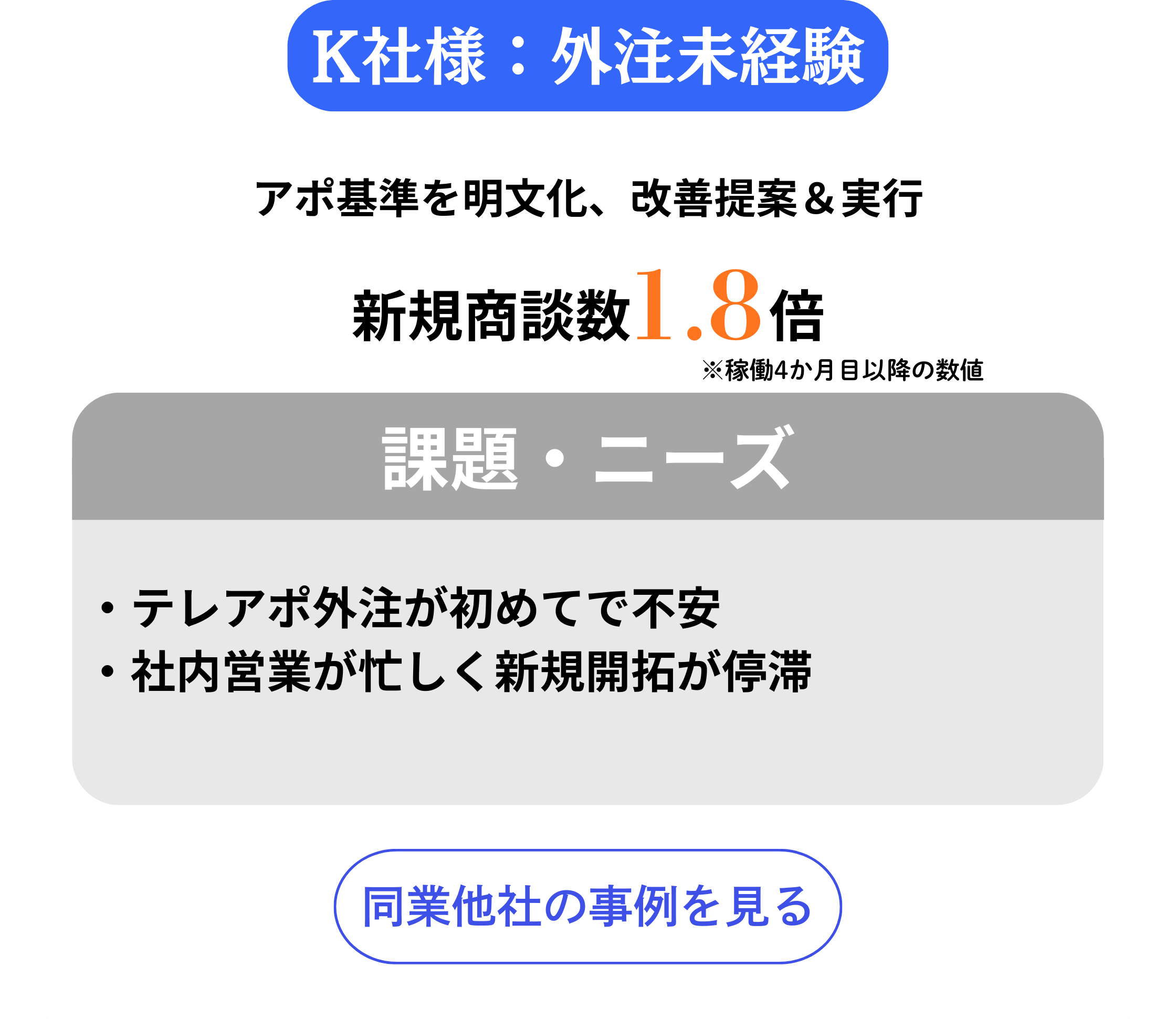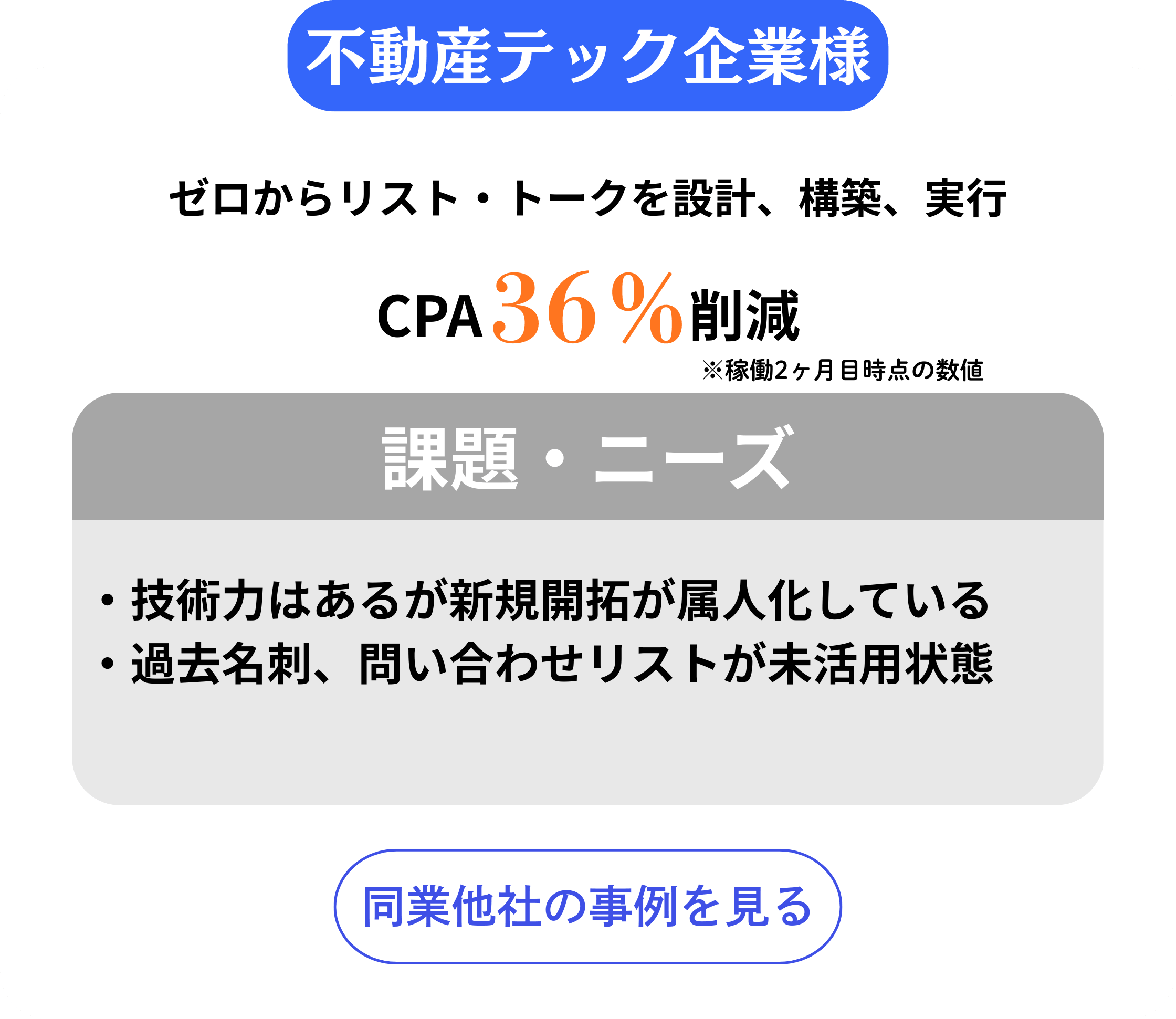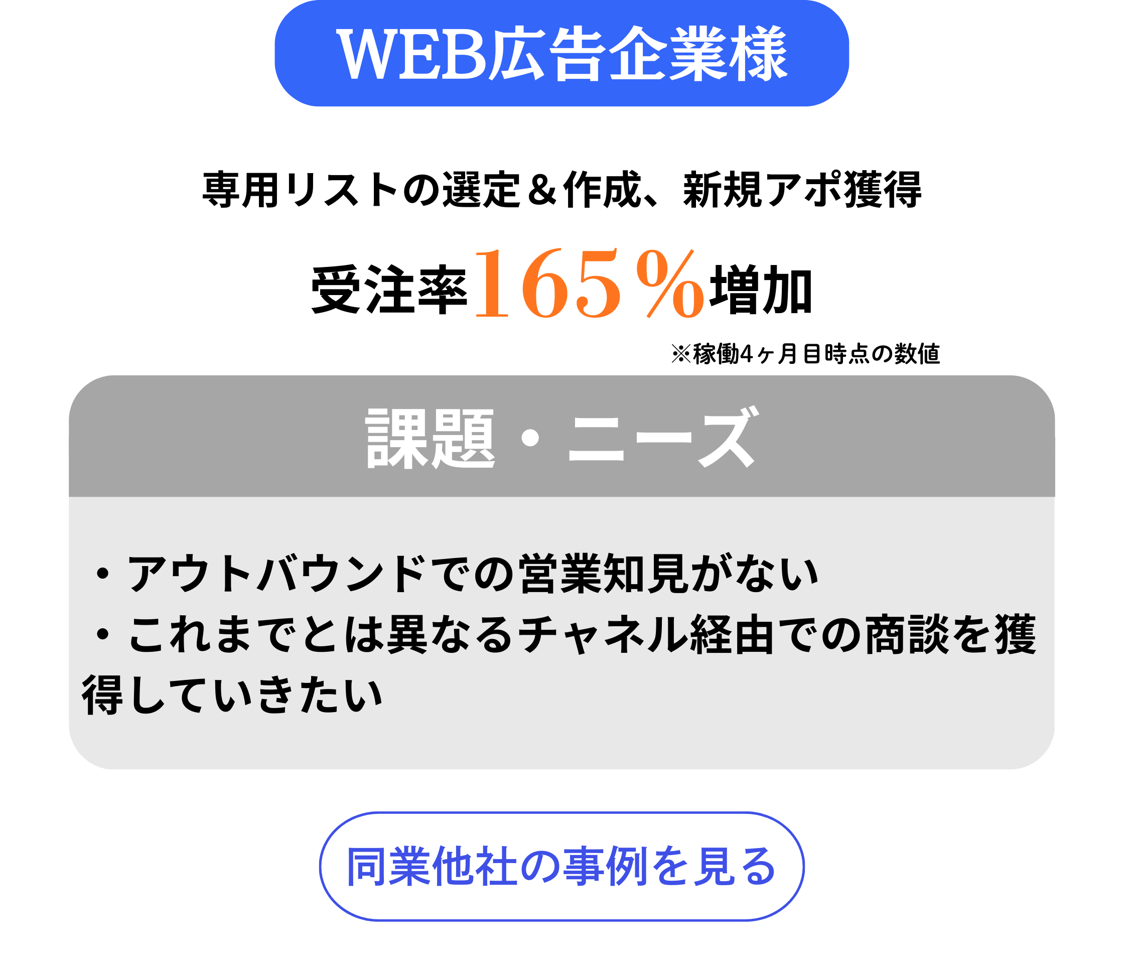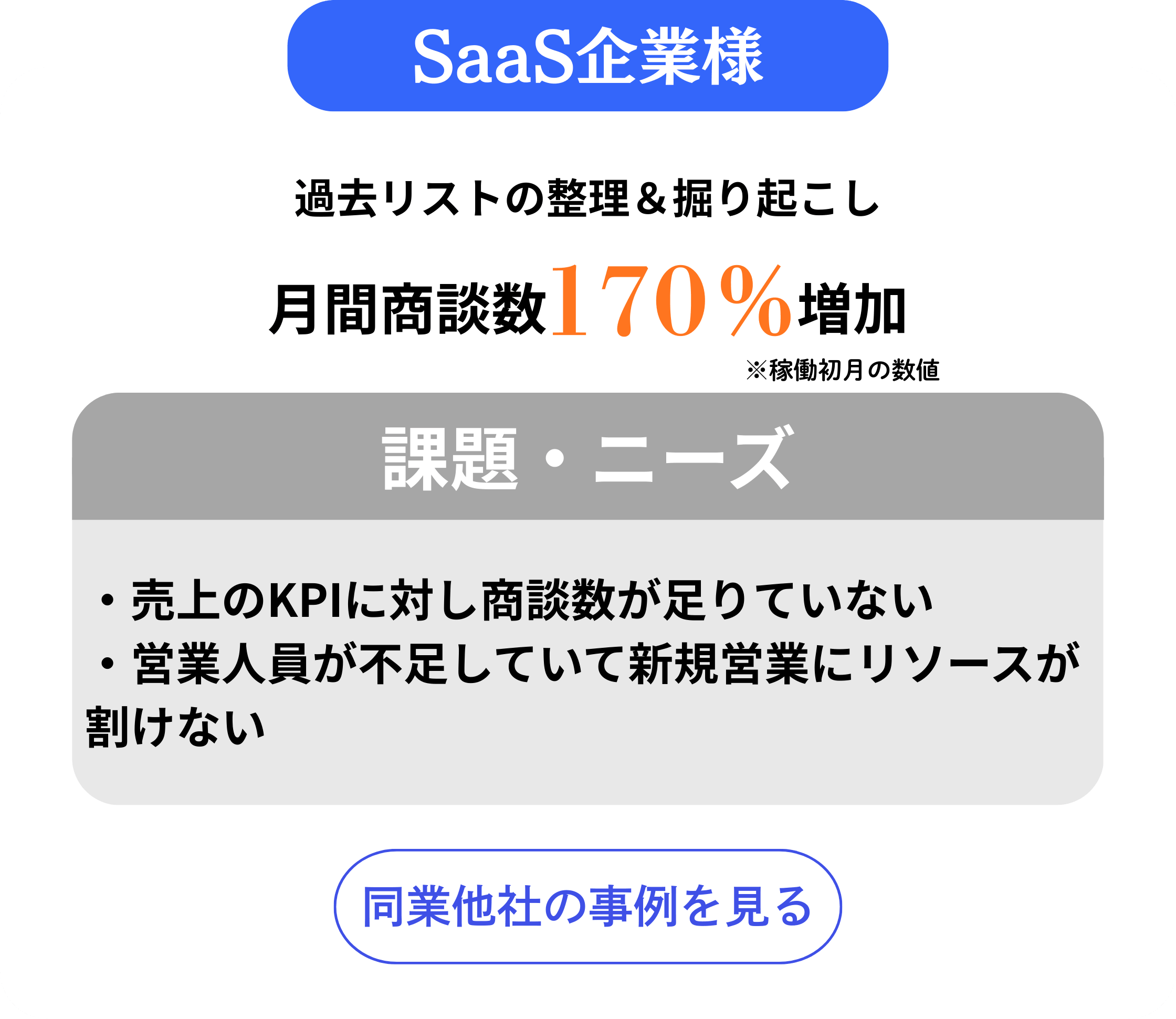 | 事業内容 | 1.リード創出・商談獲得支援「+アポタス」 2.営業戦略・営業プロセス設計コンサルティング 3.USP設計・営業訴求設計支援 |