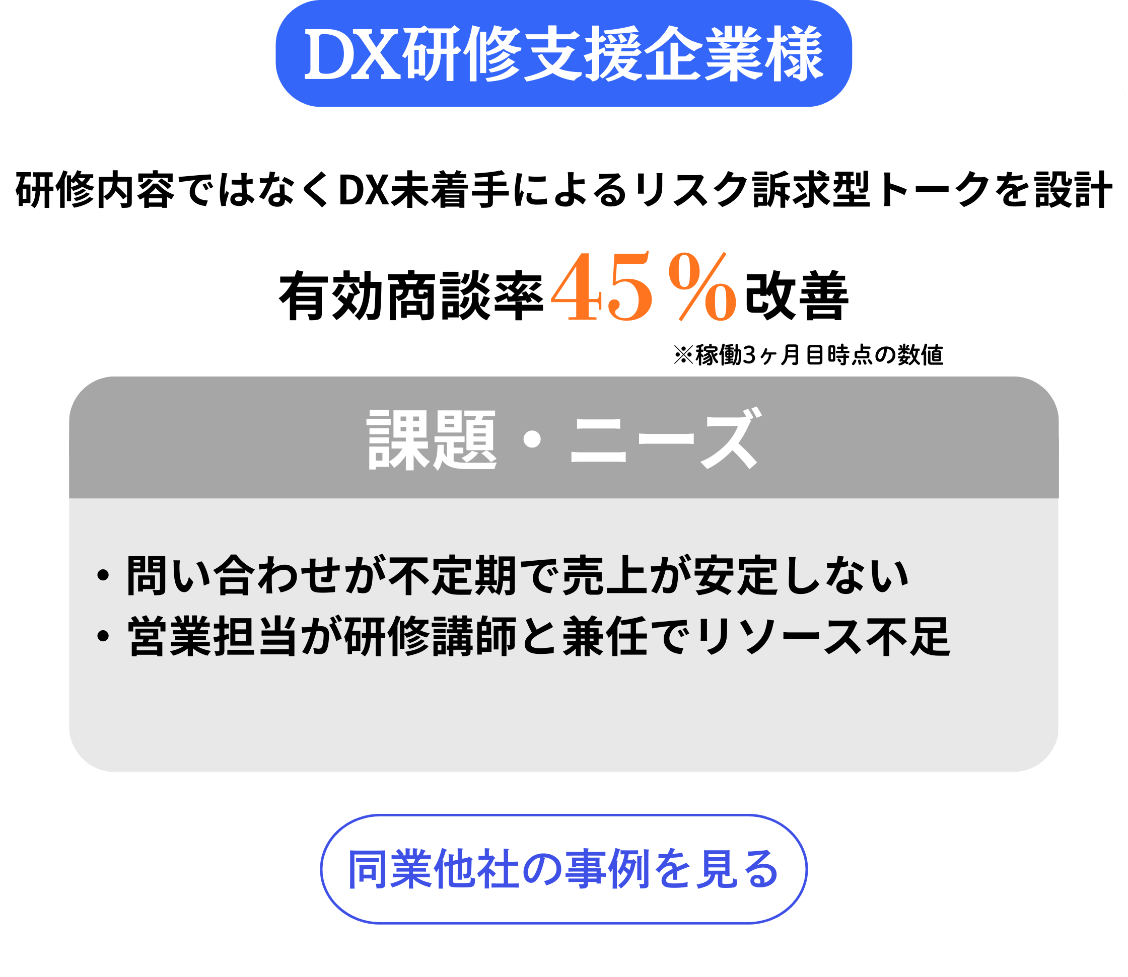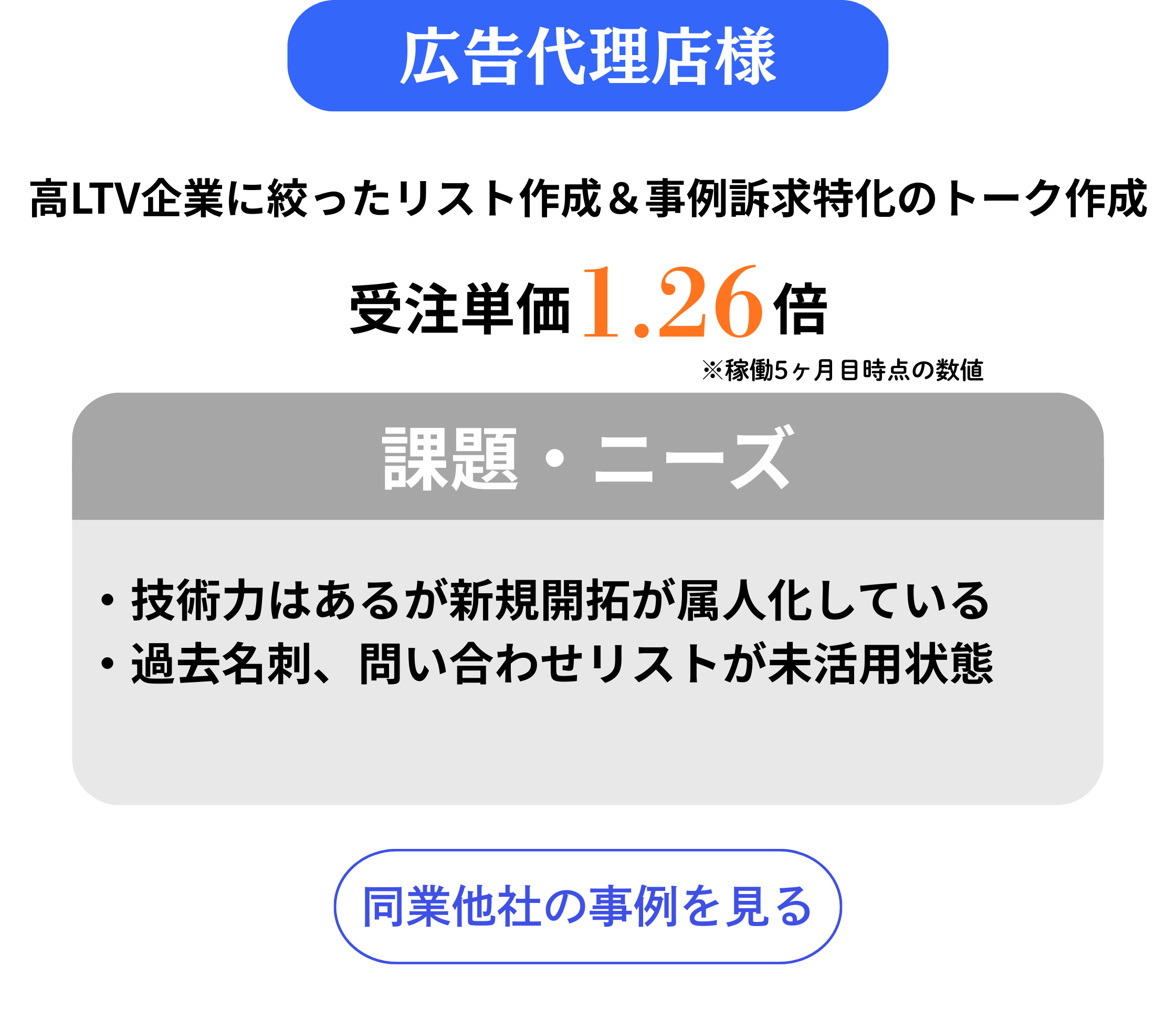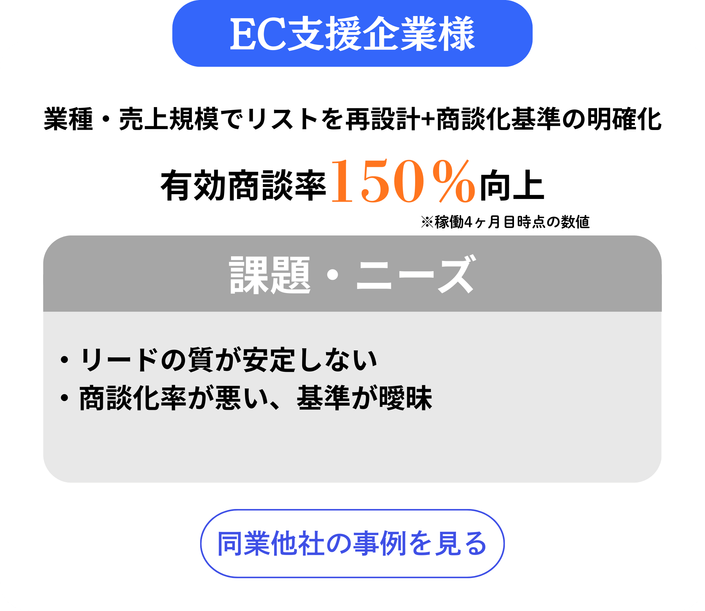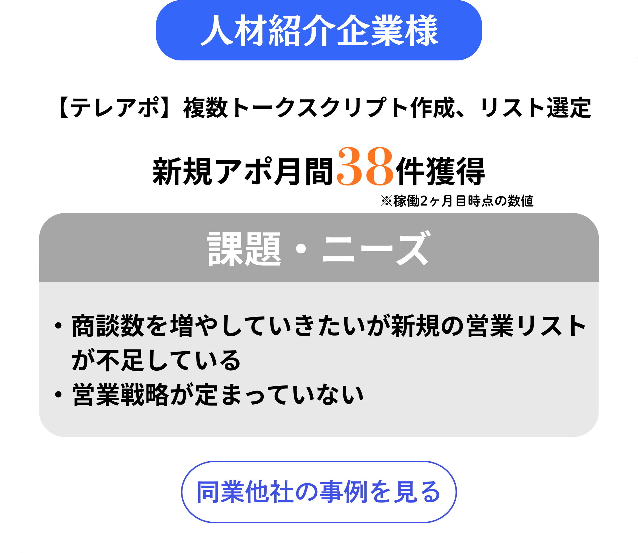 | 事業内容 | 1.リード創出・商談獲得支援「+アポタス」 2.営業戦略・営業プロセス設計コンサルティング 3.USP設計・営業訴求設計支援 |