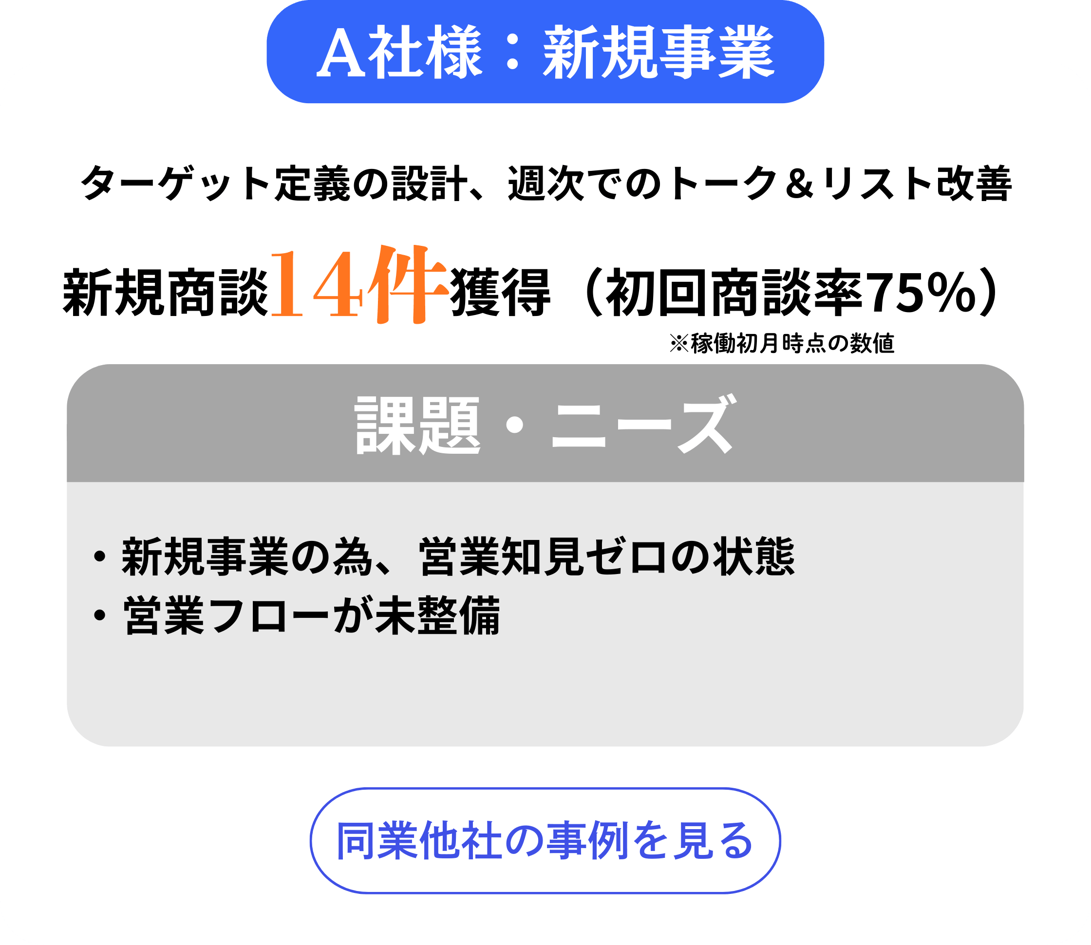 | 事業内容 | 1.リード創出・商談獲得支援 「+アポタス」 2.営業戦略&プロセス設計コンサルティング 3.USP設計・営業訴求設計支援 |