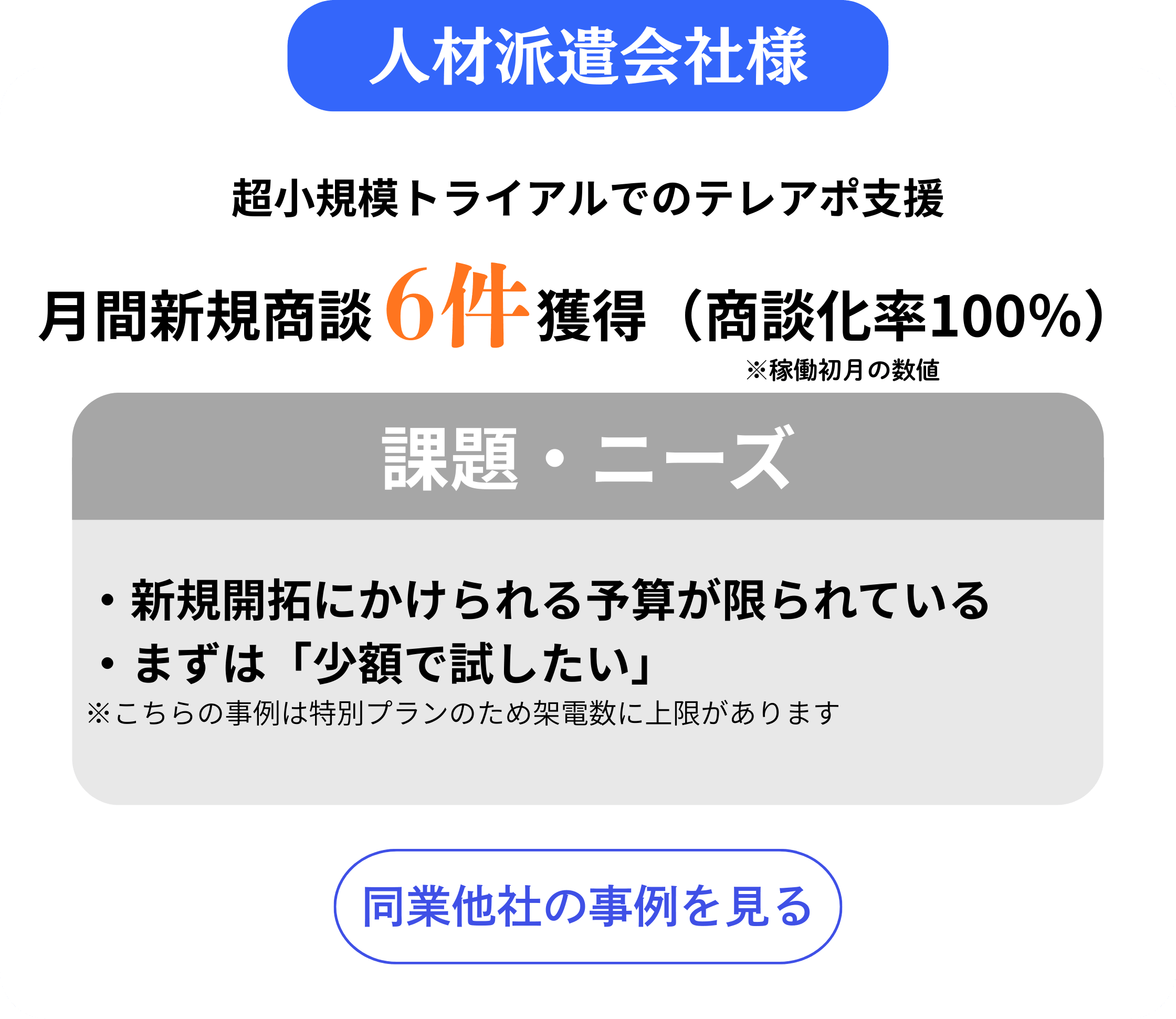 基本的に法人様のみをターゲットとした稼働になりますが、イレギュラーで個人への営業活動も可能です。一度ご相談いただけますと幸いです。